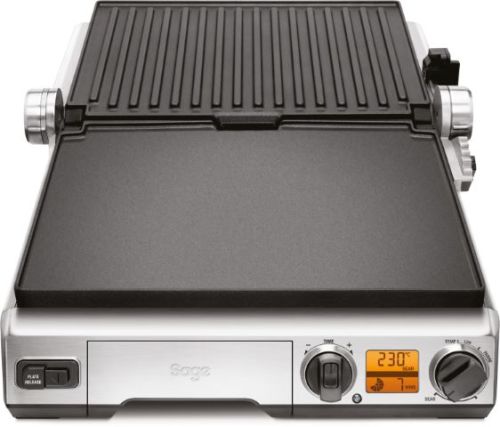 С едно просто движение контактната барбекю скара Sage The Smart Grill (BGR820BSS) може да бъде напълно отворена и двете повърхности за печене могат да се използват за печене. Оребрената повърхност е подходяща за приготвяне на месо и риба, а гладката повърхност е подходяща за приготвяне на зеленчуци, яйчени или картофени палачинки, палачинки и др. Идеална за градинско парти с приятели или семеен обяд на терасата.