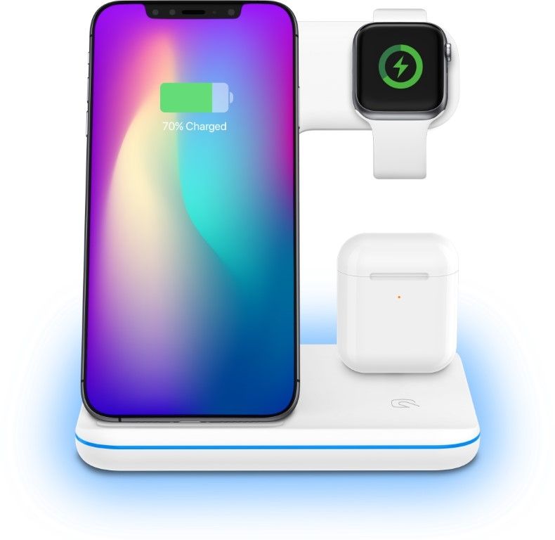 Безжичното зареждане вече не е маргинален въпрос. Аз съм зарядна станция 3 в 1, която може да зарежда до три устройства едновременно. Мога да захранвам всеки мобилен телефон, сертифициран по стандарта Qi. Другите две места могат да бъдат заети от слушалките Apple Airpods и Apple Watch. Всичко се свързва бързо и лесно. След това зареждането започва автоматично и не е нужно да се притеснявате за нищо. Вграденият конектор Lightning се грижи за свързването на Airpods. След това можете да разчитате на магнит, за да задържите часовника на място и да предотвратите случайни изпускания.