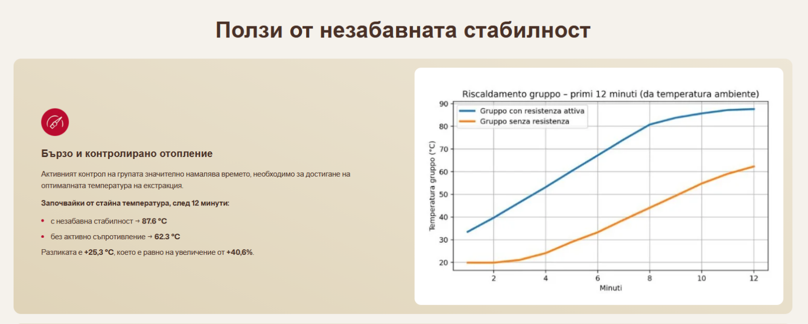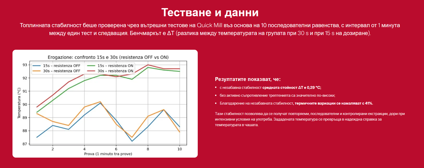 Машината е оборудвана и с технологията за незабавна стабилност на Quick Mill INSTANT STABILITY. Това я прави готов за употреба само за 12 минути и гарантира оптимална термична стабилност по време на цялото извличане, както и между дозиранията, осигурявайки винаги постоянни резултати във всяка чаша.