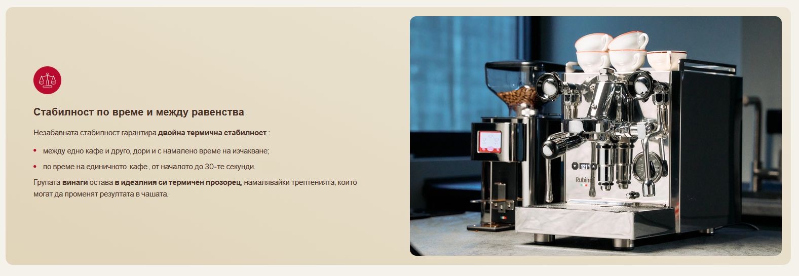 Еспресо машината RUBINO+ е създадена за любители, които търсят максимален контрол без компромис в компактен дизайн.