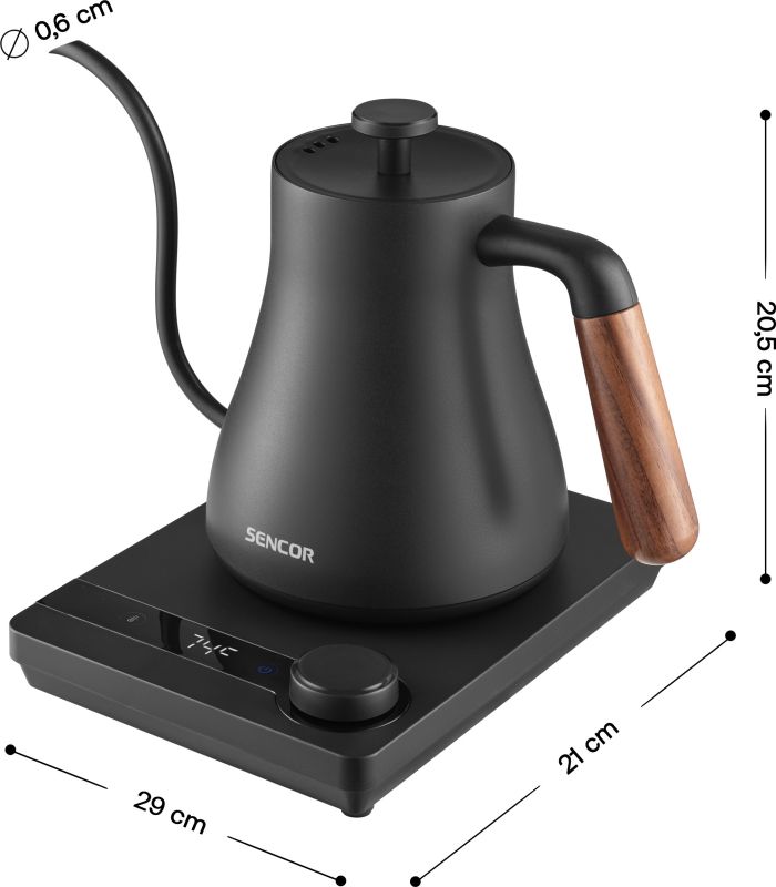 Приготвяйте кафе като бариста с тази първокласна електрическа кана с обем 0,6 л, предназначена за любителите на чай и кафе. С вграден нагревателен елемент от 1000 W за бързо кипване и дигитален панел за контрол на температурата, тя осигурява прецизно приготвяне всеки път. Чучурът тип „гъша шийка“ предлага нежно, контролирано наливане – идеален за V60, Chemex или капково приготвяне. Изработена от издръжлива неръждаема стомана SUS304 с дръжка от истинско дърво за комфорт и баланс, тя включва защита от прегряване и загряване, автоматично изключване и функция за поддържане на топлината в продължение на 2 часа. 360° STRIX конекторът гарантира безопасност и дълготрайна производителност. Компактна, стилна и създадена за прецизност – вашият перфектен спътник в приготвянето на кафе.