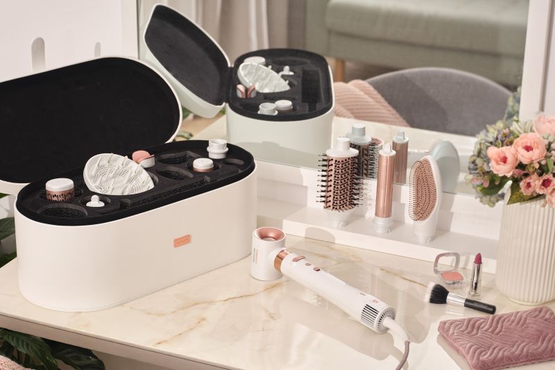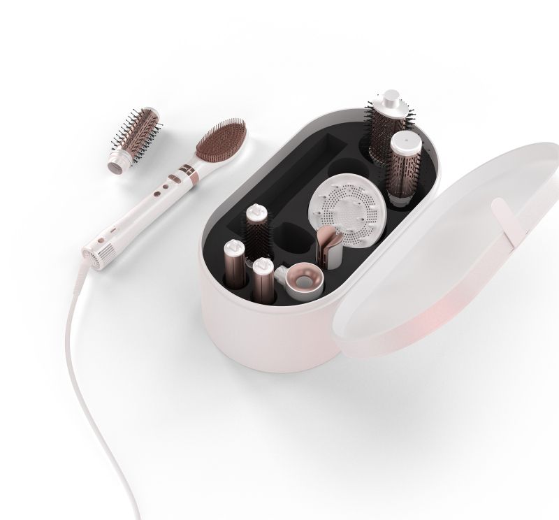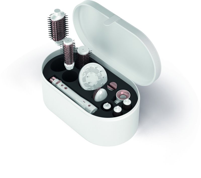 Голям калъф за стилно съхранение на автоматично въртящата се приставка за оформяне на прически и всички приставки.